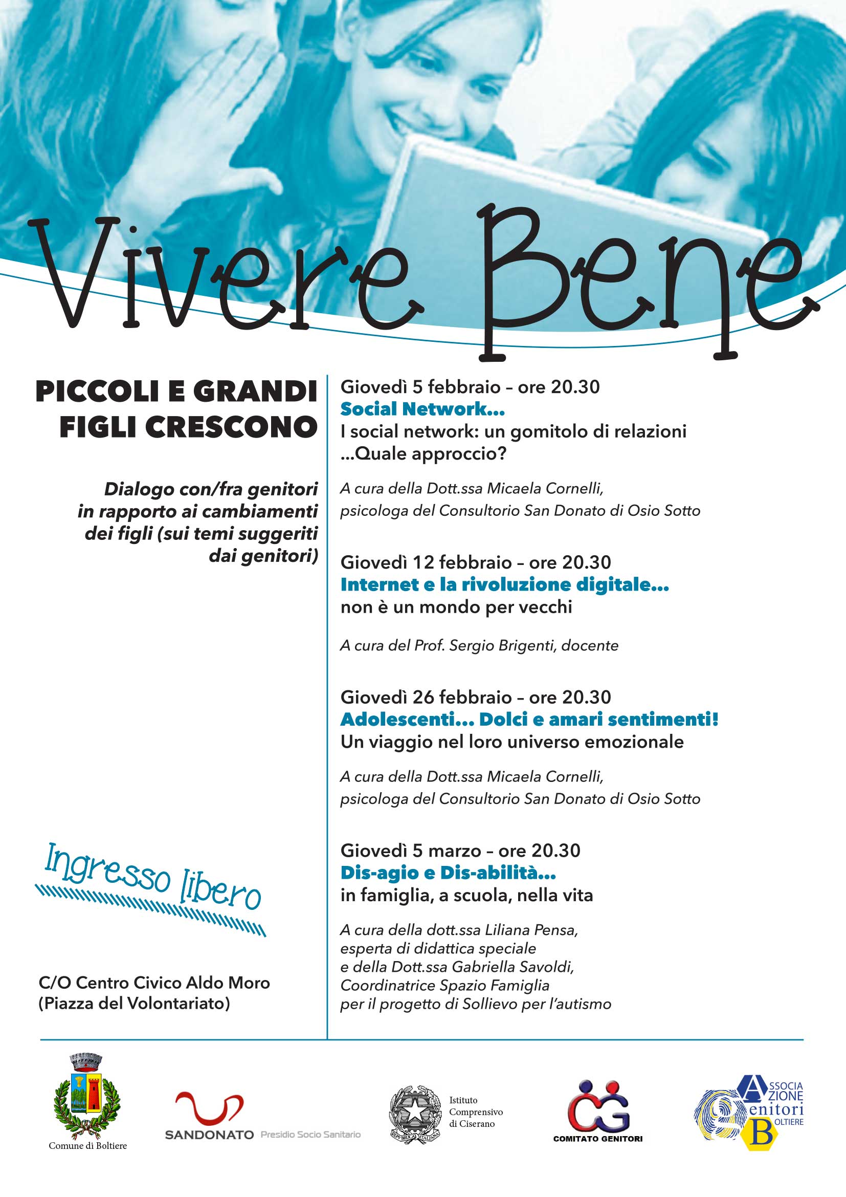Condivisione tra i genitori, le agenzie educative e l'Amministrazione comunale, continua "Vivere Bene", una tavolo aperto di confronto e di dialogo fra e con i genitori sui temi della famiglia nel contesto sia sociale e storico in cui viviamo.