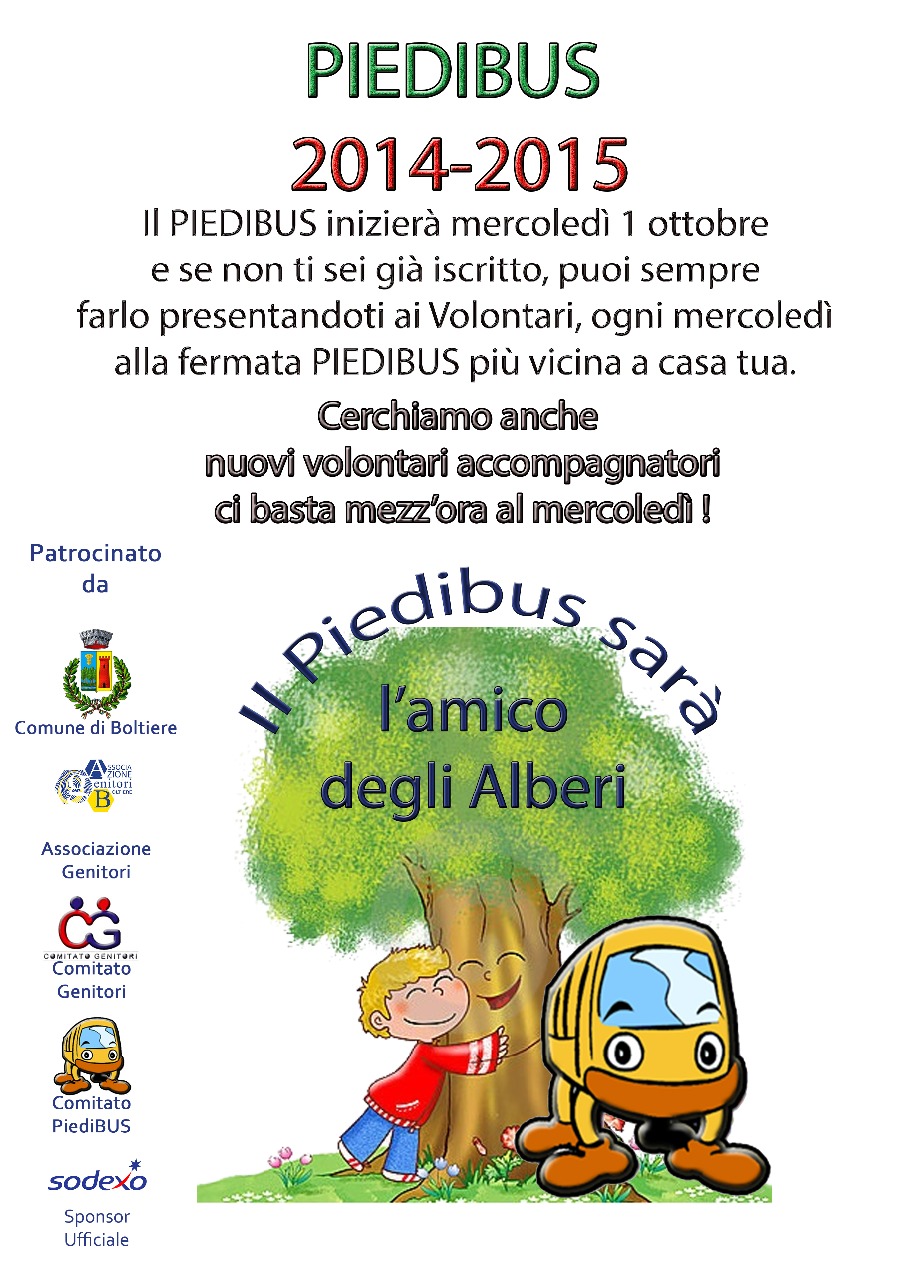 Mercoledì 1 ottobre 2014 è iniziato il Piedibus 2014 ! Ancora 5 linee e 100 bambini riempiranno le strade di Boltiere con le loro voci e il loro entusiasmo per "Una buona azione fatta con i Piedi !". Le iscrizioni possono essere fatte ogni mercoledì ai volontari delle 5 linee ! Vi aspettiamo !!!!